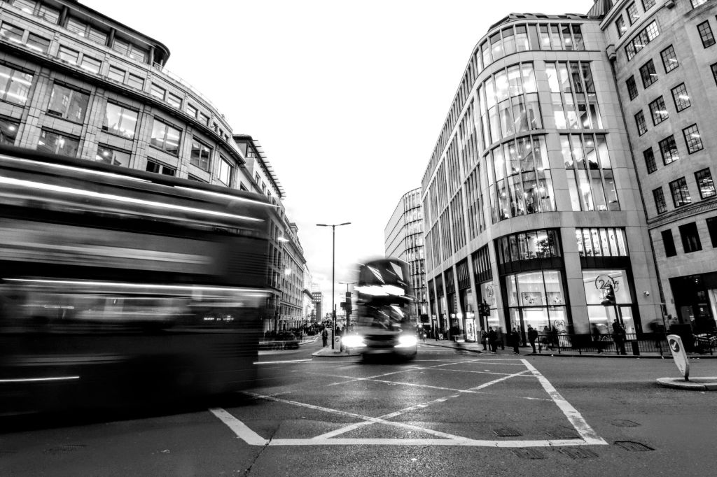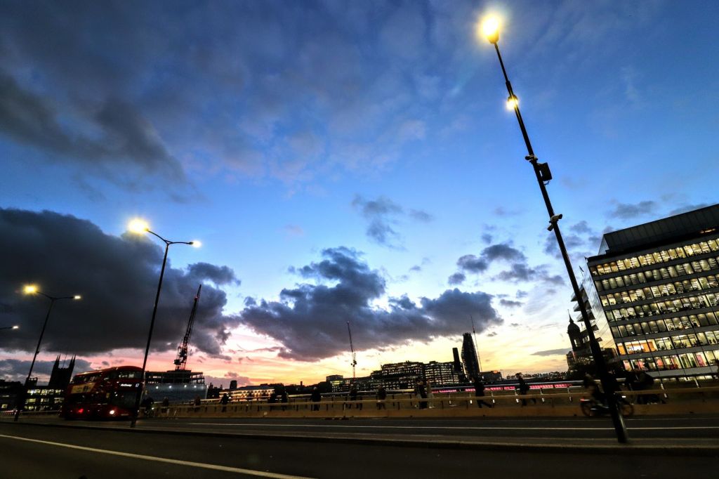 I had some fun walking across the bridge as the sun set and the day turned into night. Here’s a long view whilst standing on Eastcheap watching the buses heading into the City.