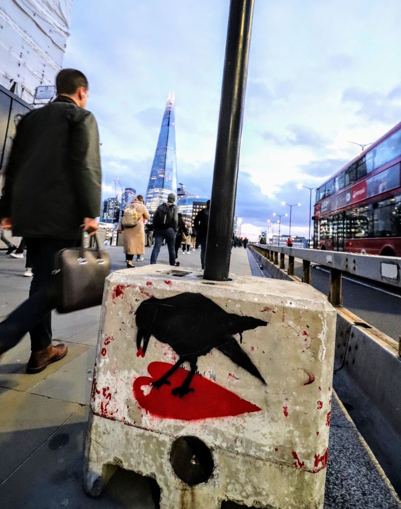 Graffiti artist mypenleaks has adorned this temporary signpost with one of his trademark symbols of a crow eating a heart. I timed the shot to capture a pedestrian and a bus, framing the image with The Shard in the background.