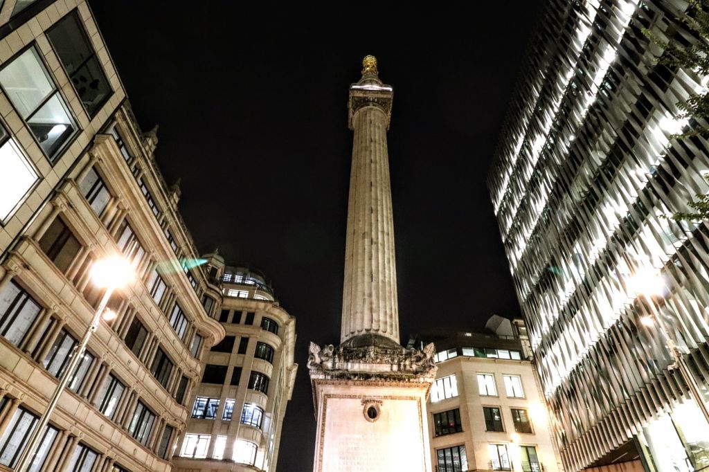 Another wide-angle (13mm) shot of the square, against a black night sky, nicely sets off the architectural features. I’ve still to climb the 311 steps to the top of the Monument—someday.