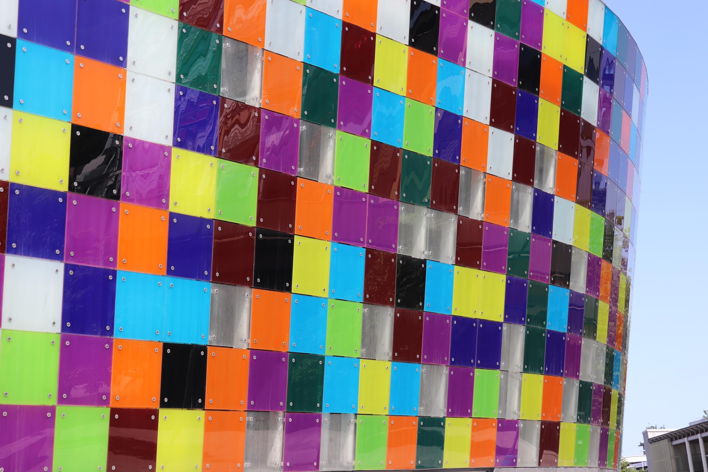 This is a short pedestrian bridge over the Ravensbourne River at Waterway Avenue headed towards the main ring road at Molesworth Avenue. The bright sun casts a dark shadow through the geometric designs of the railings onto the footpath, and creates an interesting mirror image.