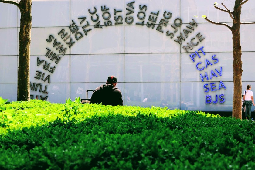 There’s a large display at either end of the seating area showing a selection of the the IATA (International Air Transport Association) three letter destination codes displayed in a semicircle. This picture tries to capture the essence of the airport at ‘a moment in time’ as the reflection shows those at rest, but the traveller in the centre foreground reminds us that he’s going somewhere (or just arrived). And the smoker on the right reminds us that this is now an outside habit…