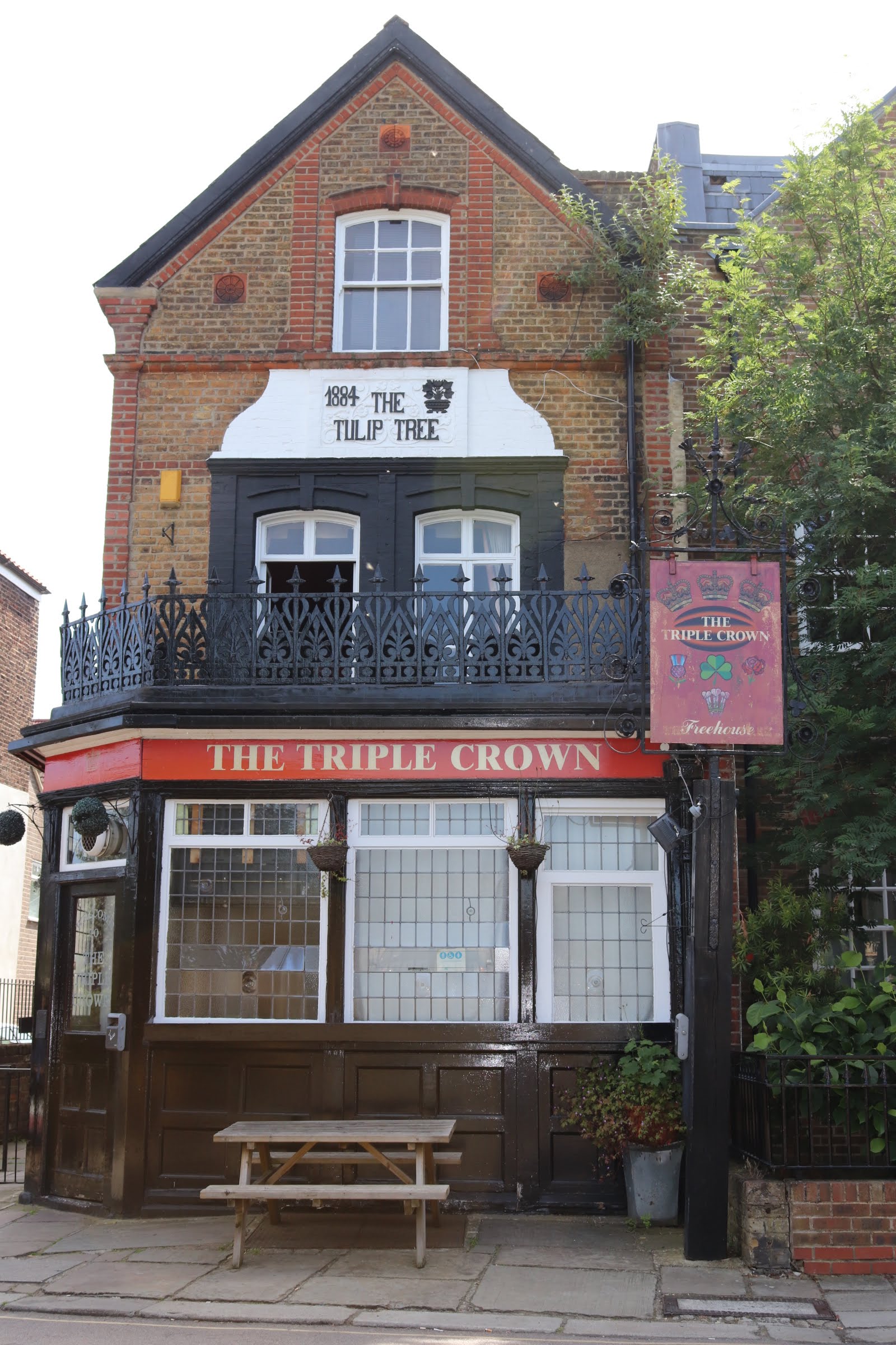 Out of the station turning right I soon find myself at Richmond Athletic Ground, the home of Richmond Rugby Football Club (RFC) and London Scottish. I try and walk around the ground, but I’m politely asked to leave as the grounds are not open to the public. So I head in the direction of the nearest pub which overlooks the grounds, unsurprisingly named The Triple Crown Richmond, built originally under the name of The Tulip Tree in 1884 as can be seen on the inscription on the upper part of the building