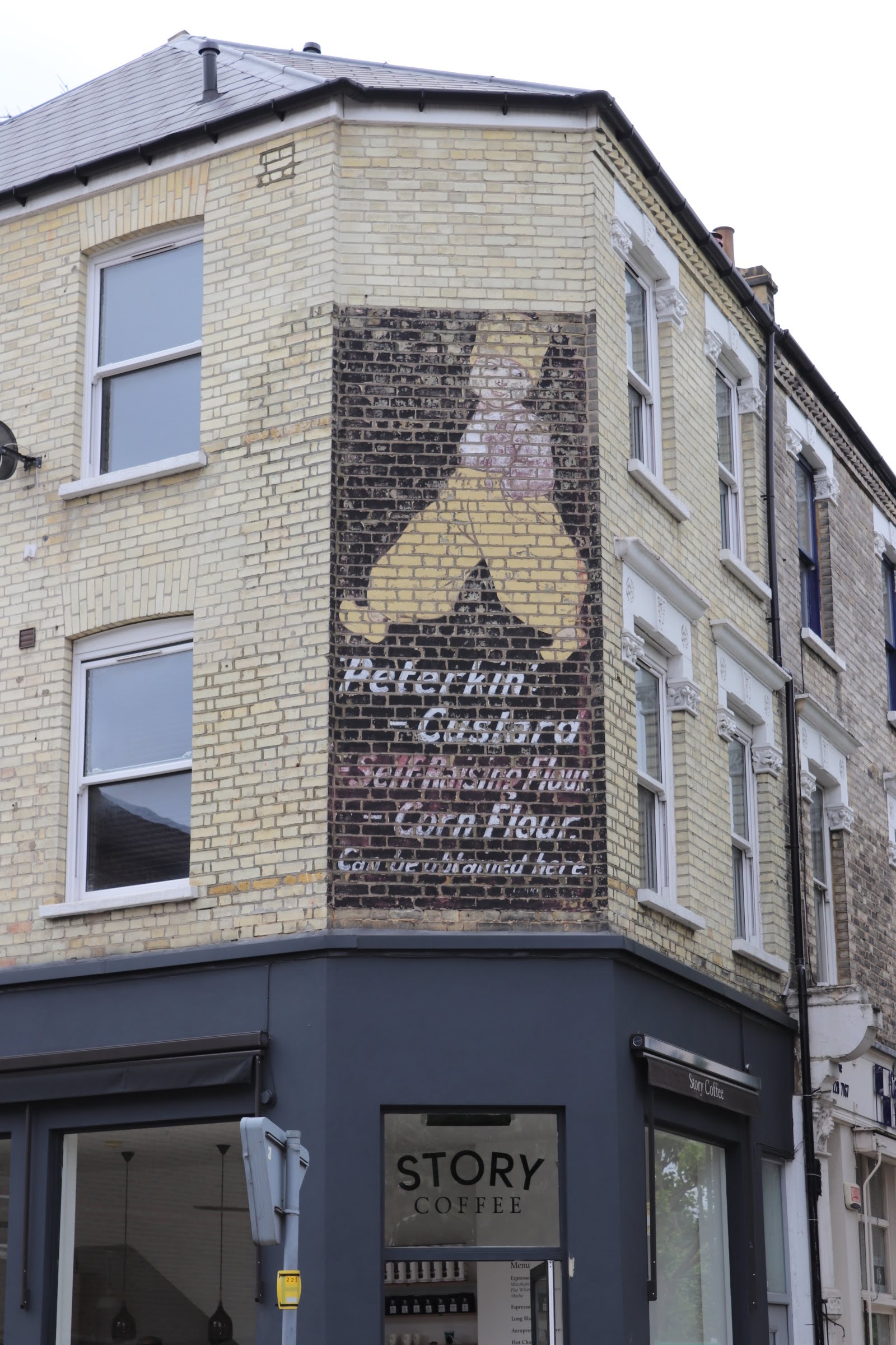 At either end of the main street, there’s the impressively 1920’s brick built library to the east, and an equally impressive crowd funded craft beer outlet – We Brought Beer to the west. If you look across the road, you’ll also see an interesting and yet declining piece of faded artwork above the Story Coffee shop reflecting the building’s history: Peterkins Custard. If you follow its history, you’ll unearth links with the movie industry as the mill where the custard was made was run and owned by James Arthur Rank.