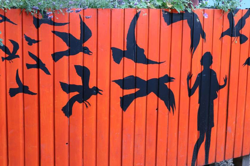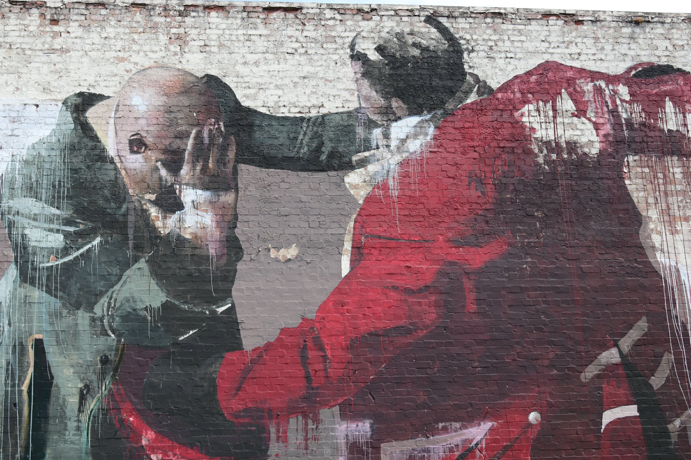 This painting/wall art/mural is deep inside the alleyway, but it’s vibrancy and bird motifs gives it a somewhat garish look. The birds maybe crows or ravens, certainly some type of carrion chasing the skirted woman is very reminiscent of a scene from Hitchock’s The Birds.