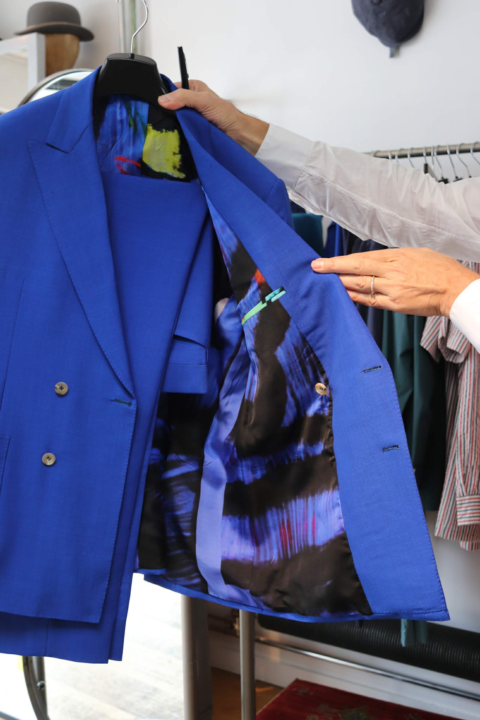I’m impressed by everyone’s calmness whilst I’m distracting them taking photos, and delighted by their open invitation to spend a little time in their presence. The dark terracotta suit in the window display is part of Charlie’s latest collection (SS19 Lookbook) which is partnered by a very striking electric blue suit with lining inspired by the artist José Chapellier.