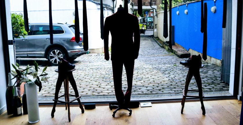 Intrigued by the wall mural on the upper level of the Dead Doll’s House, I cross the road to take a closer look, and find myself drifting into Coopers Yard up a cobbled path to what looked like redeveloped and repurposed stables although the yard’s name gives a hint at its former purpose. Adjacent to eight luxury mews, there’s an attractive, and yet understated business named ‘Charlie Allen’. I’m drawn to a large display window (see my Picture of the Day). So whilst I’m walking backwards to compose my picture, I’m beckoned by a smartly dressed gent who introduces the premises as that of Charlie Allen: Bespoke tailor.