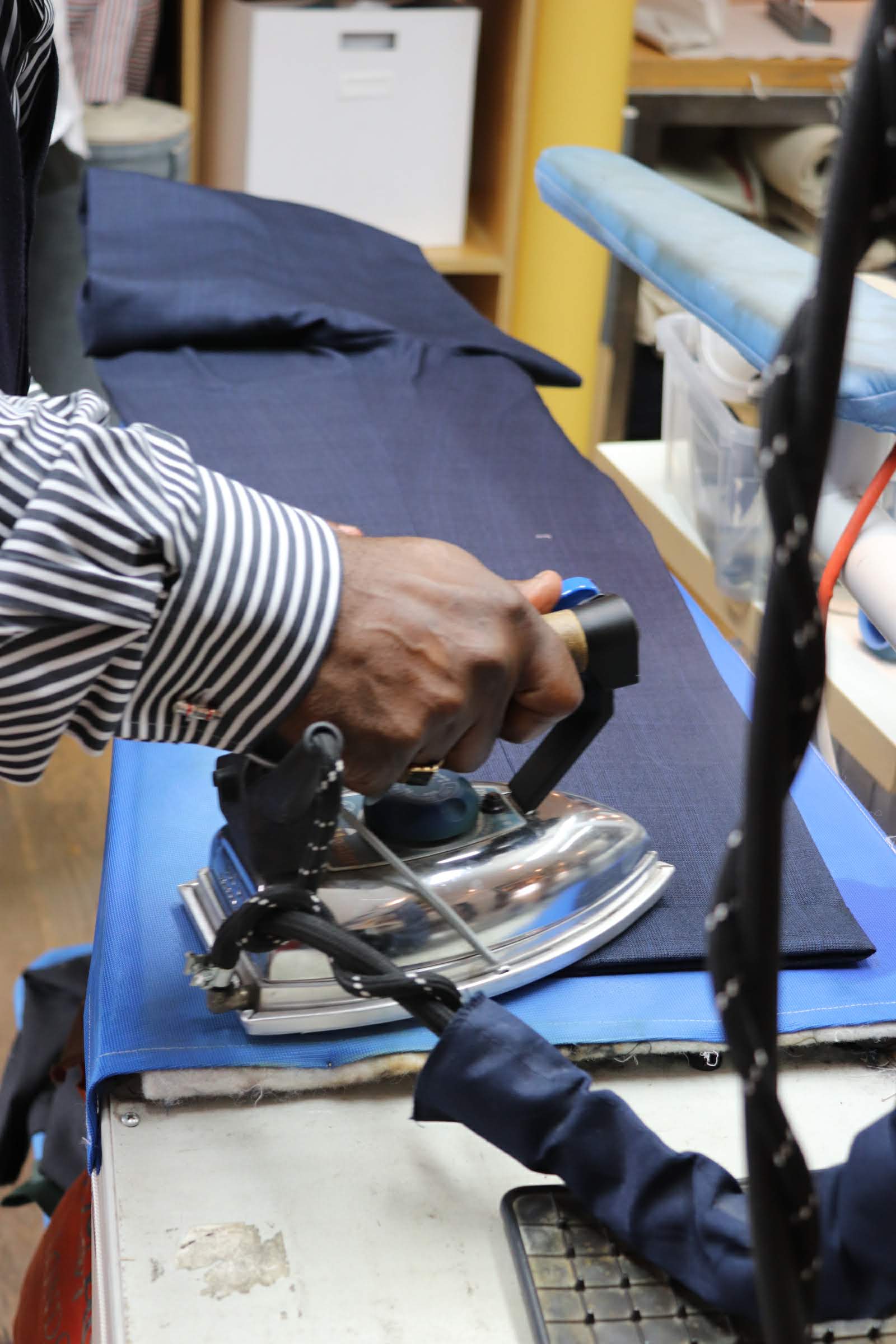 I meet Charlie, who’s a composite professional and carries on with pressing a recently cut pair of trousers whilst I’m introduced to the intricacies of his small, yet industrious bespoke tailors. I count 6 people working on various garments at various stages of preparation, each paying meticulous attention to their task in hand.