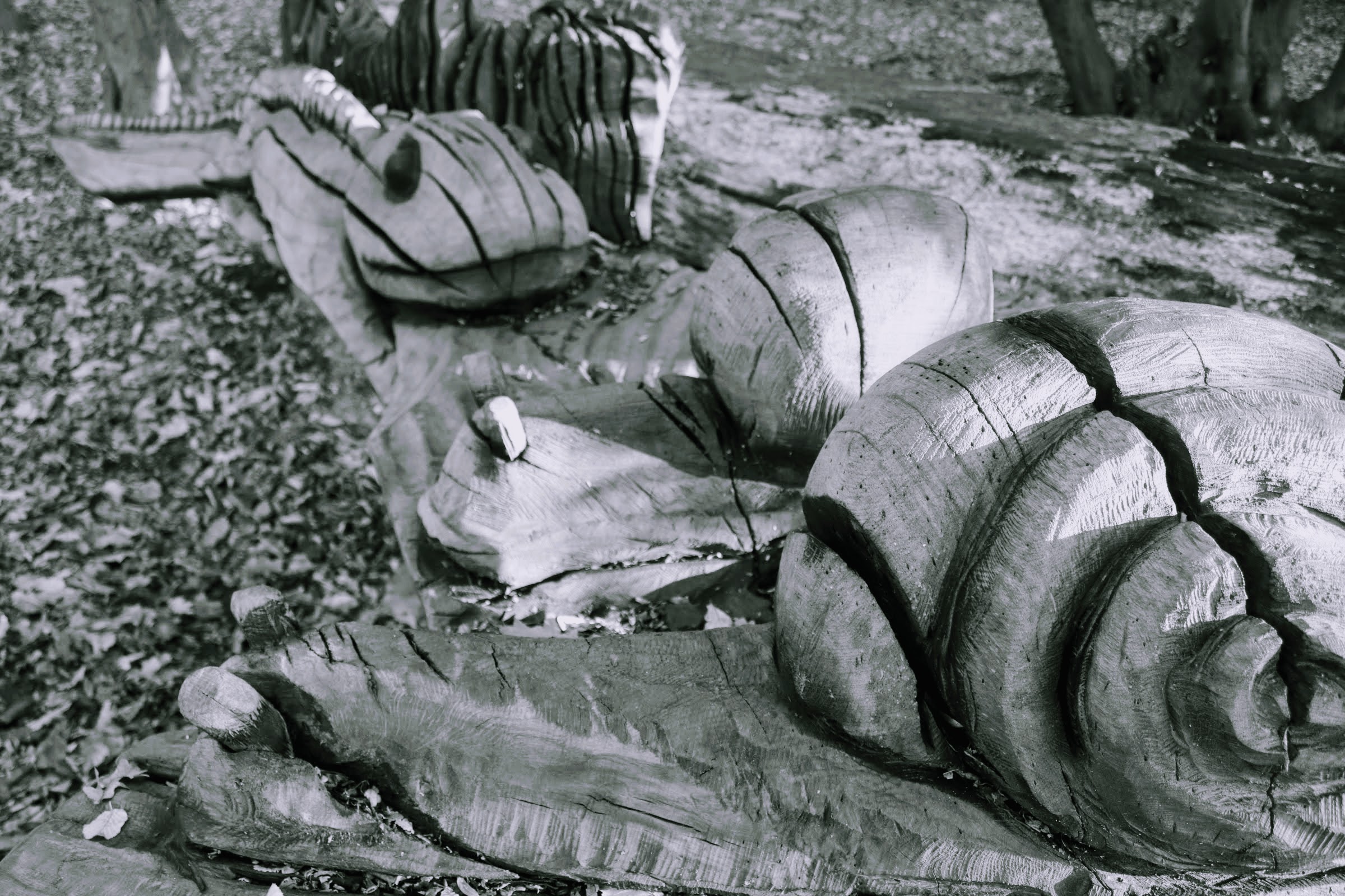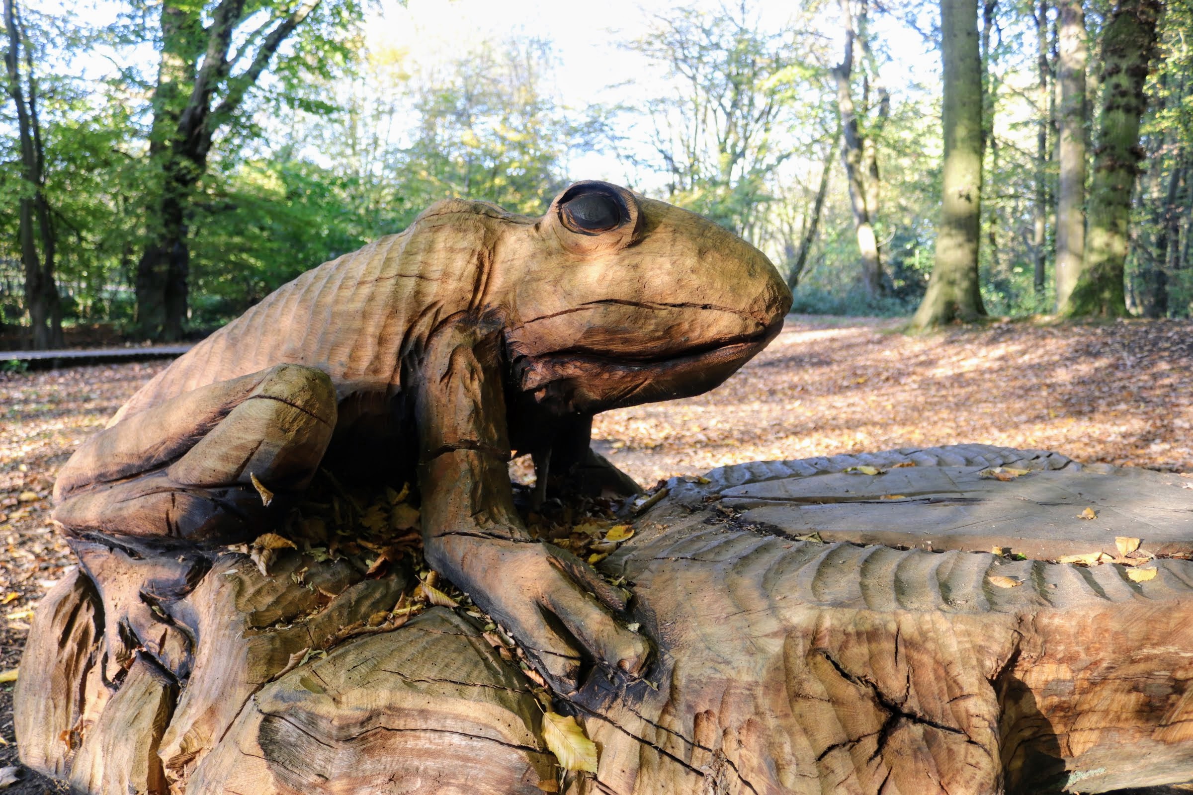 My final route is through Grovelands Park which is nestled between Southgate and Winchmore Hill, the station there being my journey’s end for the day. The park offers open land, an ornamental lake and a wooded walk alongside a stream, all of which was attractively captured by the low sunlight on a cool autumnal afternoon. I take the opportunity to try my hand at some creative shots, and to my surprise in the wooded area, I come across a menagerie of carved creatures that captured my attention for a little while.