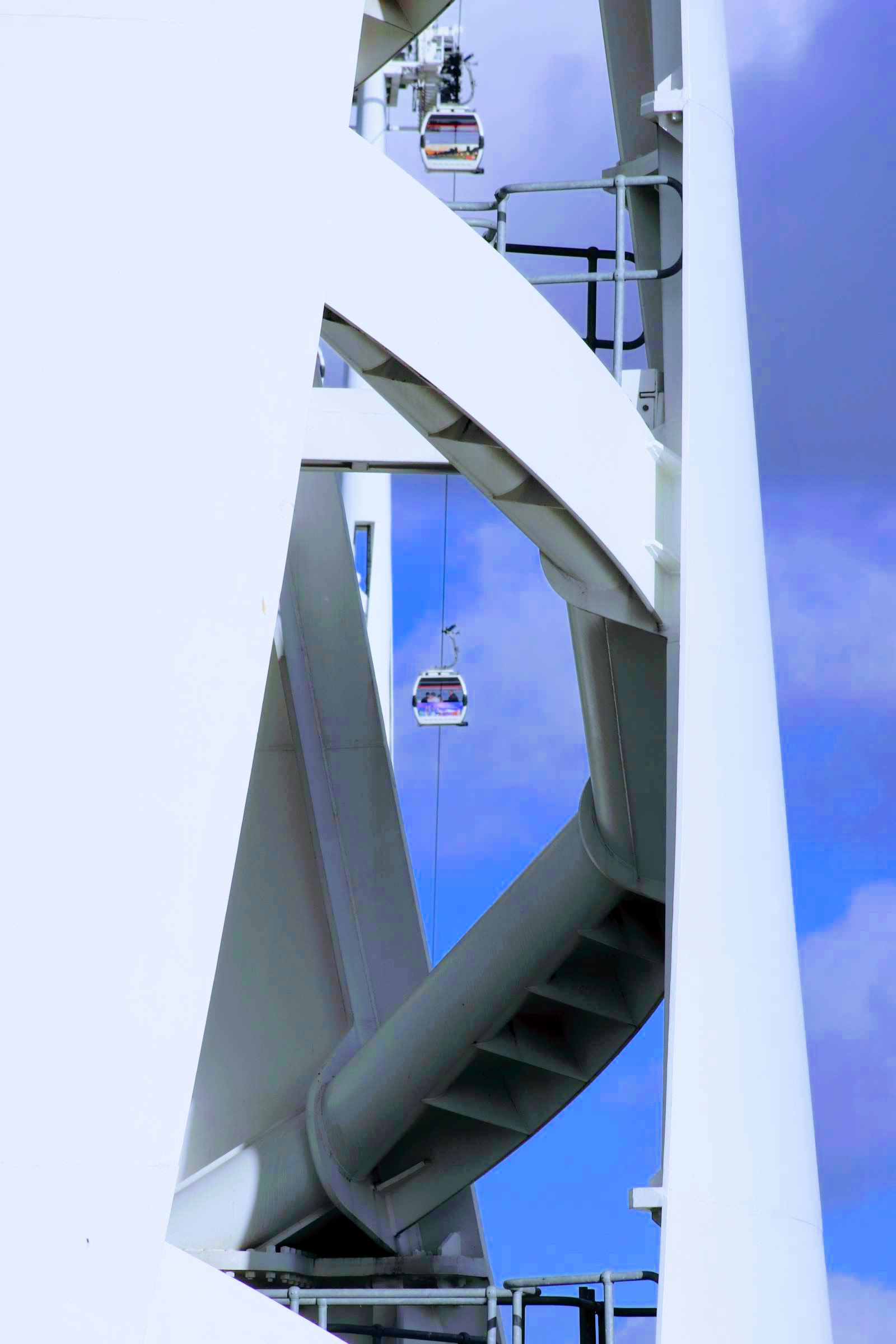 A bright clear sky helps to create an almost silhouette effect; and I’ve tried framing the sculpture with several gondolas from the overhead cable car which pass by at regular intervals. This shot captures two just passing each other in the top right hand corner, and are complemented by another two almost hidden in the shot.