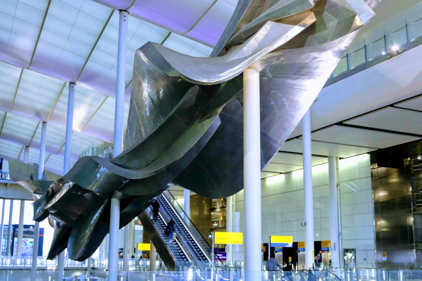 Making my way to Terminal 2, I can’t fail but be impressed by a massive hanging sculpture in the cavernous covered concourse outside the terminal. Walking around and underneath it, I try to work out what it’s representing before I stumble across a plaque explaining its title and description.
