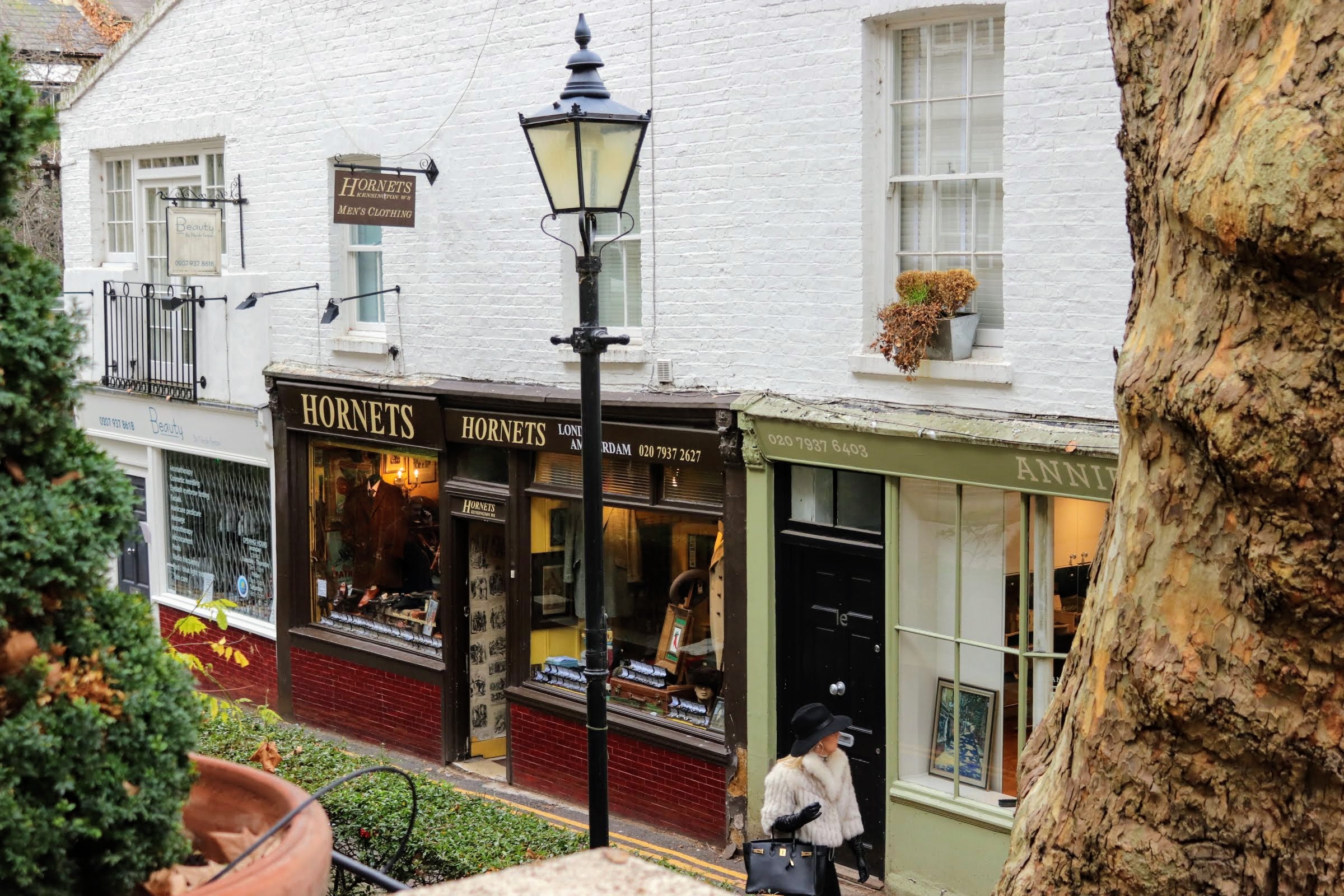And then into Kensington Church Walk and admire the bijou shops all with their independent stamp and marketplace. I’m particularly drawn to Hermione Harbutt, a bespoke wedding accessory designer, and just up the road, a gentleman’s clothier – Hornets.