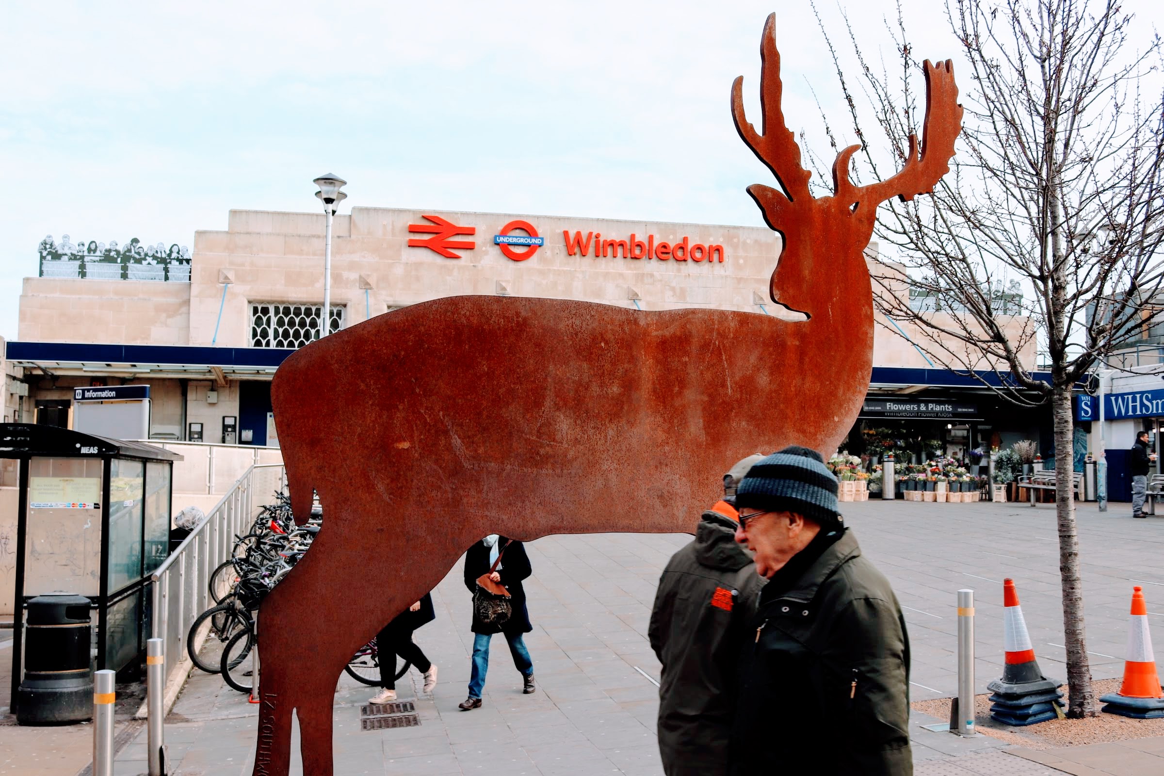 I’m Returning to Wimbledon as this station serves as the terminus for both the Tramway and the District line, and today’s visit compliments my earlier visit seven months ago. Outside the station is a 10’ high steel installation of a stag, commissioned and erected by the local authority to mark the town centre’s regeneration which was completed in 2012.