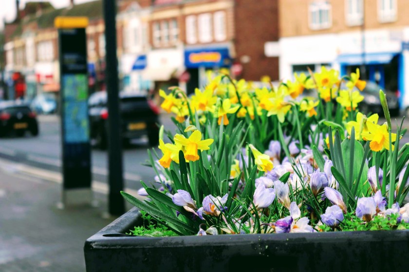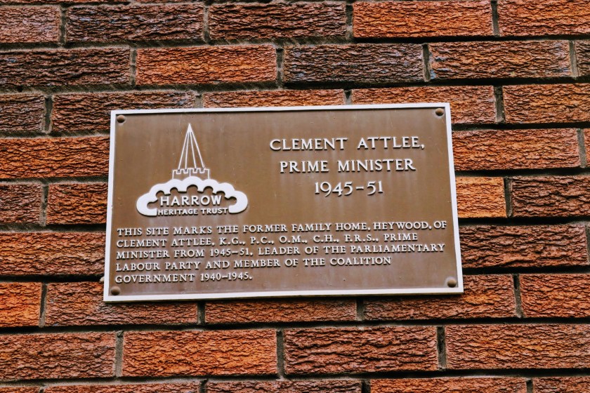 Exiting the station I head west through the bus terminus towards the shopping parade built around the main cross roads. As I do, I pass a rather unassuming block of flats with a ‘Harrow Heritage Trust’ plaque declaring the building is on the site of the former home (Heywood) of Clement Atlee, the post WW2 Prime Minister. Spring is declared aplenty in the high street with flower boxes adorning railings .