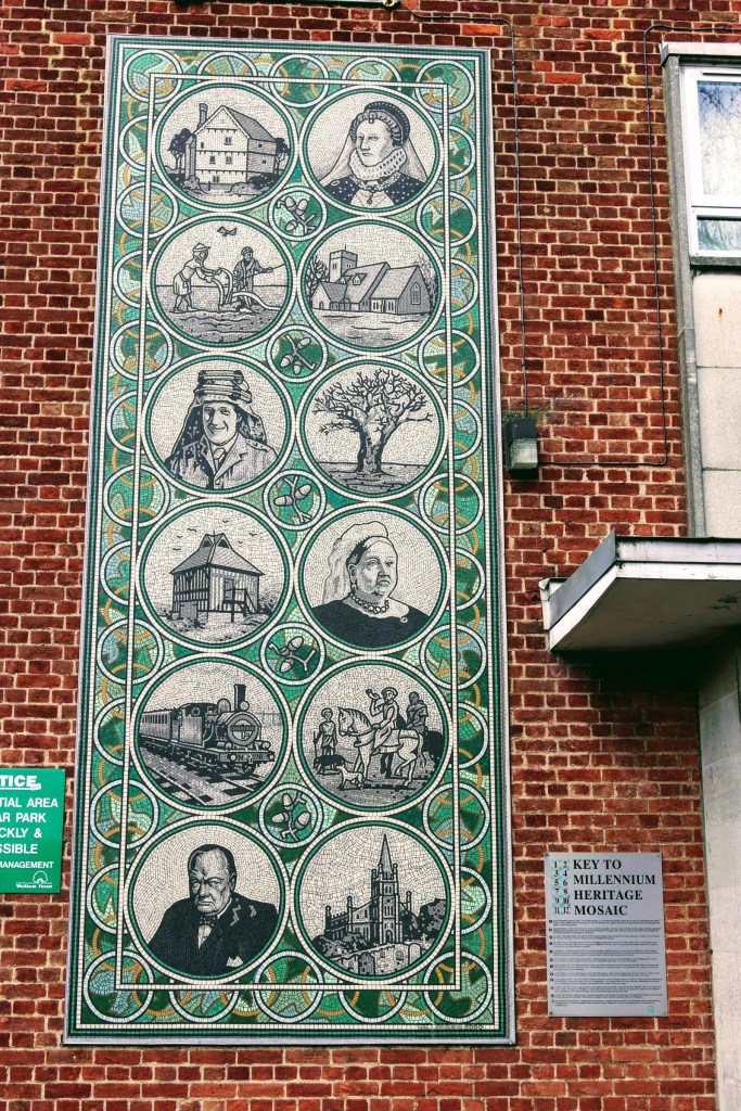 Further down the road, I pass Chingford Assembly Hall and stop to view, not the building itself, but a mosaic commissioned for the millenium depicting twelve scenes with a local interest. If you look closely at the outlining design, and apply your imagination, you could be right in seeing the underground ‘roundel’ has been incorporated as well…or maybe that’s just my imagination.