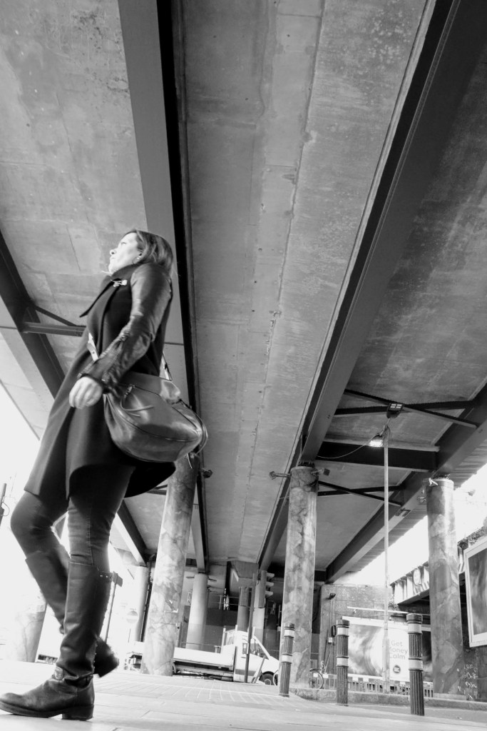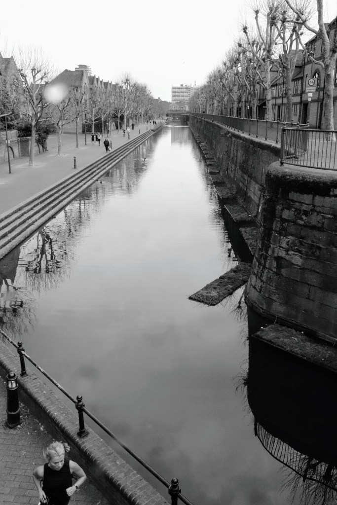 Leading into Dock Street, I take some time admiring the bridge support structures and looking at their symmetry against the ever changing backdrop. The pillars have been painted with a marble effect which is no doubt an attempt to hide their concrete greyness; and those on foot walking past are evidently oblivious to their surroundings and my photographic efforts.