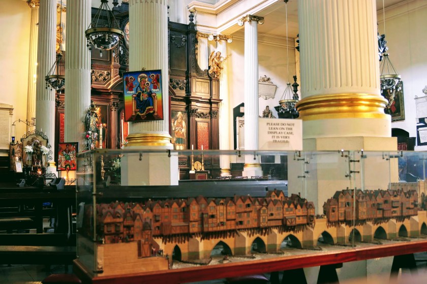 By the doorway there is a long, if not at least ten feet long, encased model replica of the original London Bridge bedecked with houses and shops. The vaulted ceiling is magnificent, as indeed are the stained glass windows in homage to the good saint, and before leaving I feel compelled to light a candle.