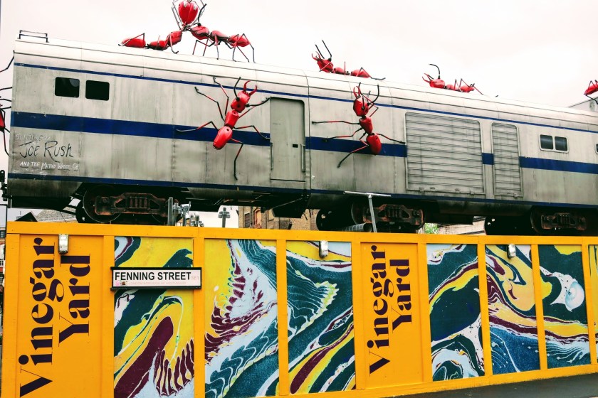 I exit the station south side and I’m immediately drawn to a sight of red ants crawling over a full size train carriage atop a low level building. Go see it as it’s an impressive piece of art from Joe Rush – never heard of him? Well he also created the Arcadia spider at a recent Glastonbury festival.