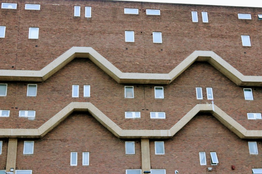 Southwyck House – looking vastly like a prison with a concrete zigzag to delineate the frontage with its co-joining staircase looking like a caged pen to keep the inmates in. A housing complex built in the 1970’s in anticipation of a motorway flyover which was never built. One commentator records that it is known locally as ‘Barrier Block’ as indeed that was its design purpose. Hideous to think that this social housing was considered acceptable enough to be built. The architectural design whilst creating some features, does nothing to uplift the feeling of isolation and incarceration the building exudes.