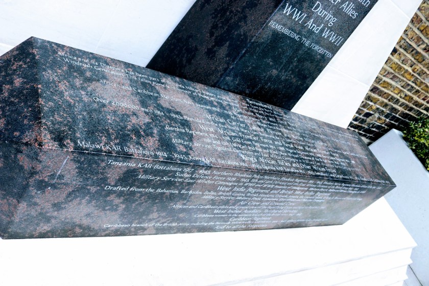 A memorial at Windrush Square – the memorial is to those service men and women from Africa and the Caribbean who served alongside the forces of the British Commonwealth and her allies during the two World Wars. The popularised ‘Windrush’ name comes from the arrival of the Empire Windrush from Jamaica on 22 June 1948; the ship docking at Tilbury from the Caribbean carrying 492 immigrants and, for many, symbolises the beginnings of modern British multicultural society. The open square now overlooks the Black Cultural Archives, the only national heritage centre dedicated to collecting, preserving and celebrating the histories of African and Caribbean people in Britain.