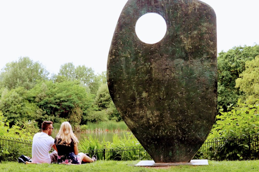 My final stop is on the south side of the lake by the Barbara Hepworth sculpture entitled ‘Single Form’. This is a smaller version of the original which stands outside the headquarters of the United Nations in New York. It was commissioned as a memorial to Dag Hammarskjöld, secretary general of the United Nations and a friend of Hepworth whose work he collected. The positioning of the young couple enjoying a lakeside picnic looking out over the water adjacent to the sculpture stuck me as romantically poignant. I took some pictures with their permission, and this one is a fitting end to today’s travels. My thanks to Dario and Sammy and good to meet you both.