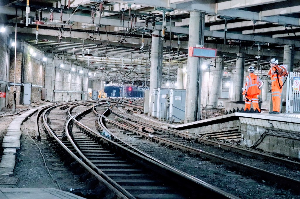 On my countless journeys in and out of this station over the past 30 years I’ve frequently stared thoughtlessly out of the window at the passing trains shuttling to and from remote destinations. But today I decided to try and get a different view and travelled one stop on the Overground to Bethnal Green station. The view looking westerly towards Liverpool Street station is bewildering with new buildings all around, iconic City buildings such as the Gherkin to the left, and further afield to the south, more iconic buildings in Canary Wharf such as One Canada Square. But the one that fills my vision is the myriad of stanchions and overhead lines that converge from 18 platforms in Liverpool Street Station into the six independent tracks that feed to services north and eastwards.