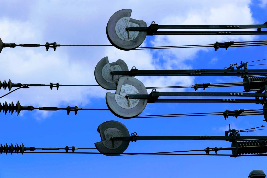 I also take a moment to reflect on the old and new whilst at Bethnal Green station too. The first image here is of a cut off stanchion, presumably supporting on older (now redundant) overhead line. What attracts me to this is the creation of the rusty ‘H’ in the discoloured, but nevertheless colourful concrete base. The second is a collection of pulleys, set against the azure blue sky, that take the tension from the overhead lines. I think it’s an interesting study showing off some of the intricate engineering involved in providing overhead power to today’s trains.