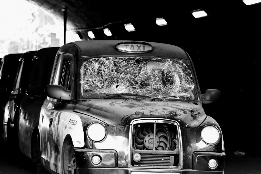 There are several contenders today, but I’ve chosen this one of an abandoned Black Cab with its windscreen smashed in for several reasons: It epitomises travel in London; it has reached its own end of the line and it is one in a long line of Black Cab’s abandoned under the railway arches nearby London Taxi repair garages.
