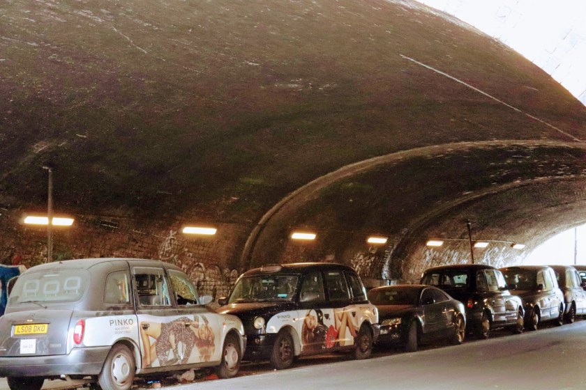 In true ‘East Enders’ style the area in the immediate surrounds of Bethnal Green station is awash with garage repair shops, predominantly for London Black Cabs. Three Colts Lane, and the cut through under the railway in Collingwood Street and Tapp Street are awash with Black Cabs in various states of dis-repair. My ‘picture of the day’ is representative of the state some of the abandoned cabs have been left in. These garages stretch under several arches and peering into the workshops it’s clear they’re a hive of activity.