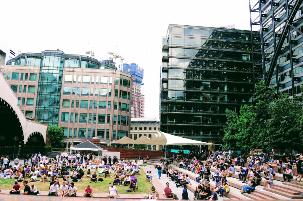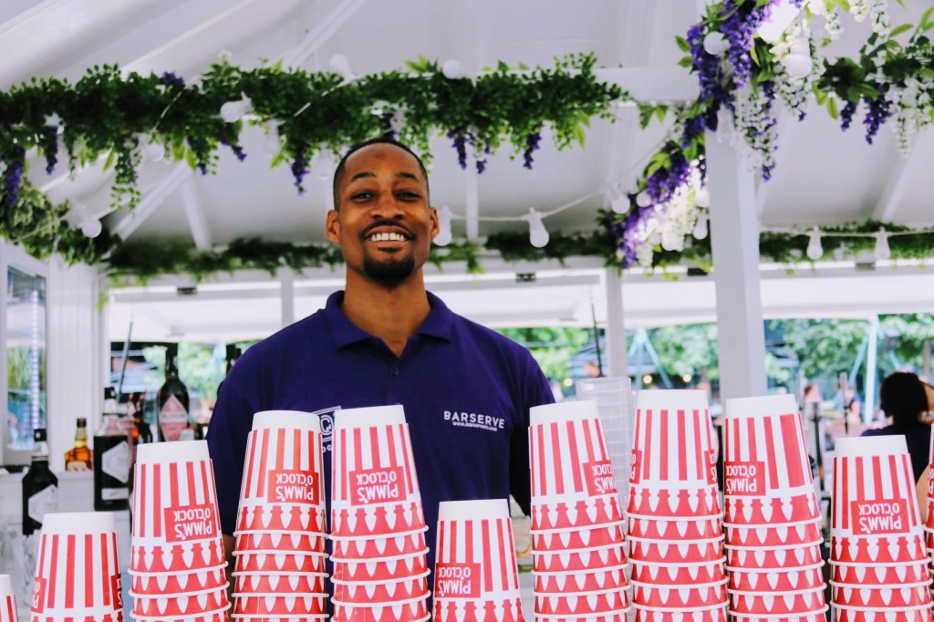 Exchange Square is a hive of activity, mostly office workers wining and dining or simply taking a break. Today has the added attraction of the Men’s semi-final tennis matches at Wimbledon on show on large screens for all to see. And what better way to enjoy all these activities than with a cup of Pimms, cordially served by Akeem…cheers!