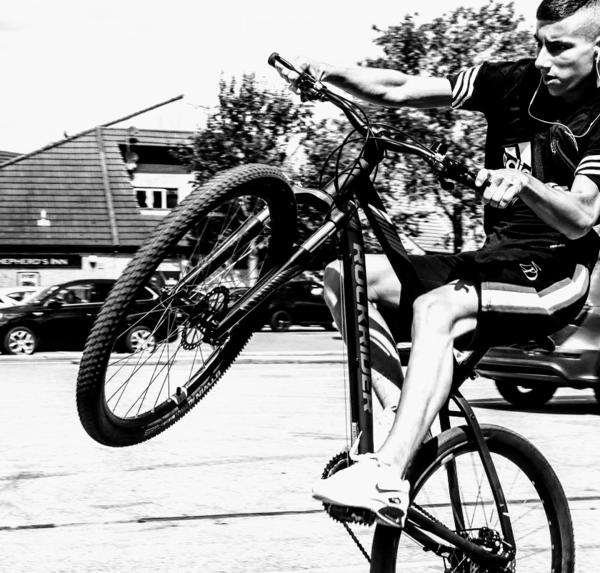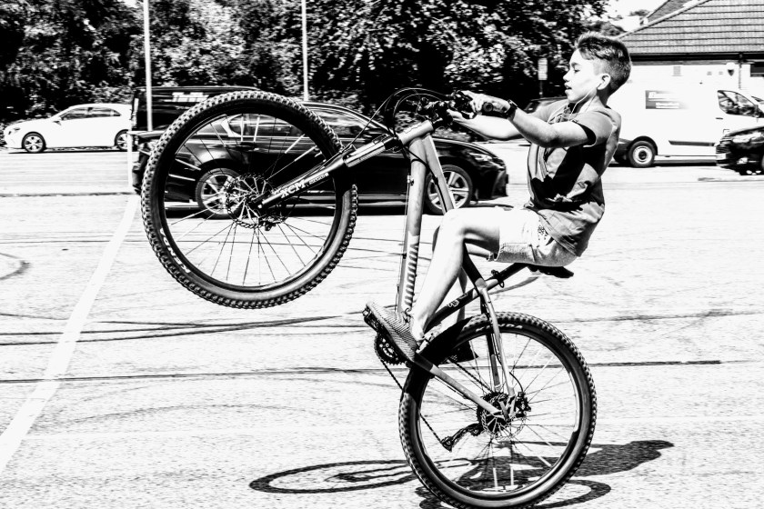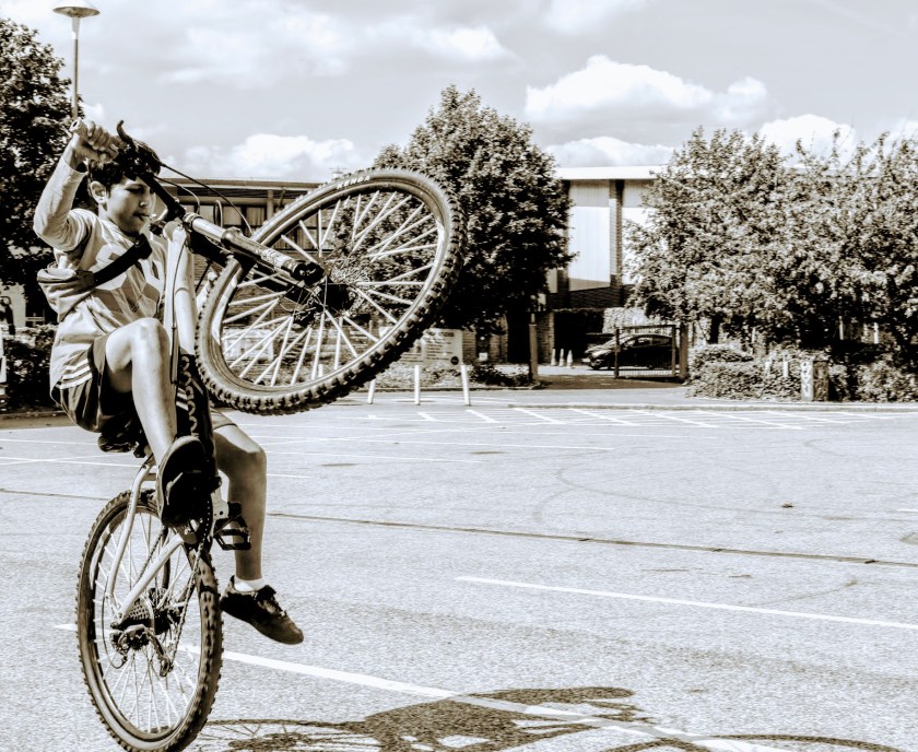 Now a shout out to to five cyclists I met during the day. First to Mahammad, Andre, Lucas and Edward. Four young lads who were practicing wheelies in the Asda car park when I walked through earlier in the day. I stop to ask them if they’d be happy to be photographed, and after a short conflab amongst themselves they seemed happy to pose. This is a short collection showing their various skills during their valiant ( and safe) efforts up and down the car park. Thanks lads and I hope you enjoy them?