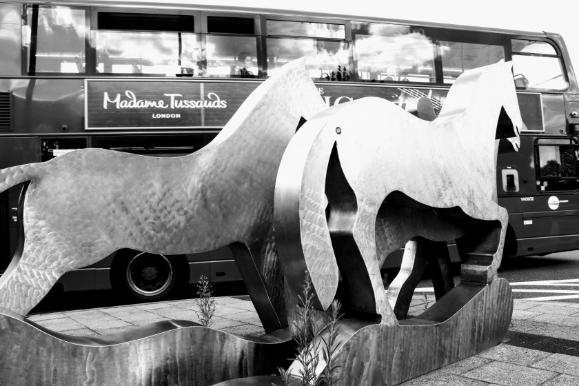 The station is a typically open DLR station with a modernist style overlooked by shrubbery hiding the surrounding housing estates. And across the road guarding the entrance of the bus station is the sculpture ‘Horses’ – depicting two horses created in steel by the artist Brian Yale.