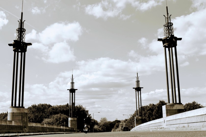 I write about Gallions Reach under my Picture of the Day, but on my way there I take a slight detour as I’m seduced by four decorative bridge posts I can see from afar. They’re on a one way road feeding via Royal Docks Road, an extension of the North Circular as it crosses the main A13 arterial road headed towards Beckton. At the top of the bridge, there’s evidence that it had been planned to go elsewhere as there’s a fenced off section where the road comes to an abrupt end. Research indicates there were plans quite some time ago to build a bridge over the Thames at this point over to Thamsemead, however this never materialised. This link offers an artist’s impression of how the bridge would have fitted in. So now it’s almost a one way road to nowhere; sadly though I can’t find any reference behind the intricacy of the bridge architecture. I wonder if there’s any significance with the area’s dockland history? If you know, please drop me a message.