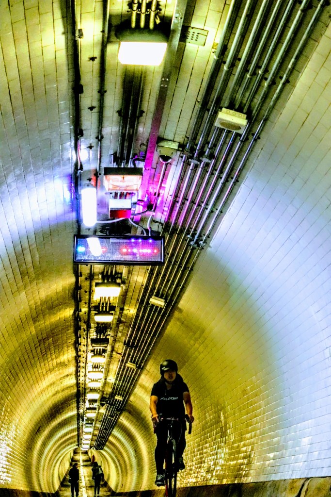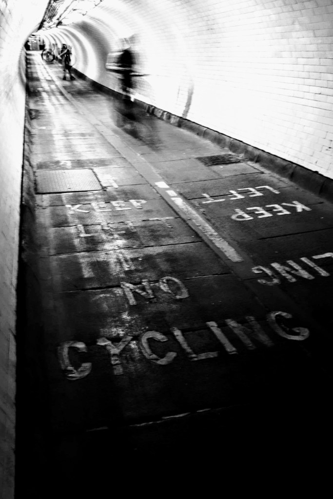 My final shout out is to Samson who I met in the Woolwich foot tunnel. He was riding through and I happened to be standing by a No Cycling sign at the time and I tried, unsuccessfully, to capture the moment. Anyway, a few seconds later he returned asking to see the pic and explaining it hadn’t quite worked, he agreed to repeat the effort and help me to recreate the moment. I wanted to reflect the moody lighting of the tunnel and capture the motion, so I avoided using a flash and panned the shots as Samson rode past. I believe this one captures that effect; so thanks again Samson, and great to have met you.