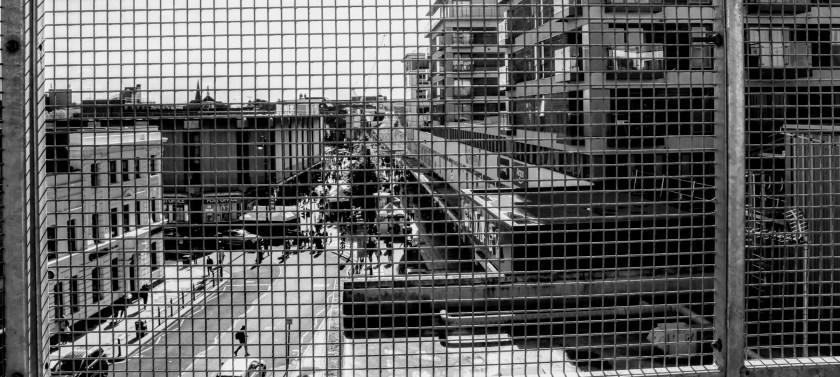 The shopping centre itself is a little old and tired, it’s an open style market place with fixed and temporary stalls in the main square. But in fairness, the centre has made some effort to spruce the place up as this view suggests. It’s of the overhead walkways that joins the car park to a central lift shaft in the middle of the market area; it’s an interesting ‘upside down’ view from the reflective mirrors on the underside of the walkways.