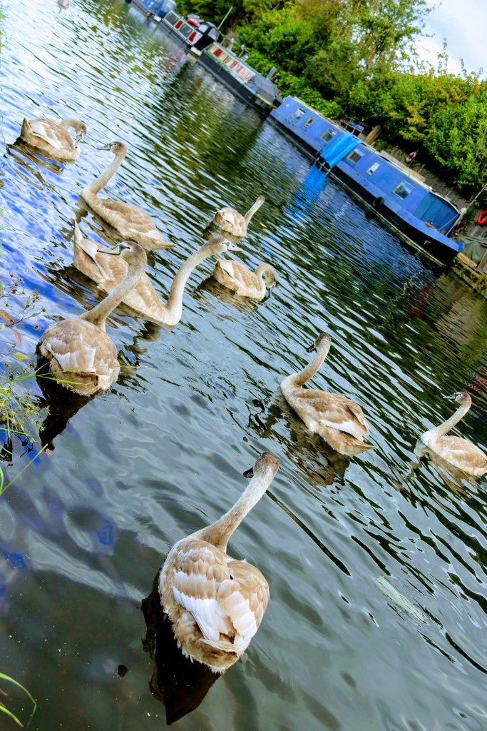 I follow the path under The Swan and Bottle Bridge (no 185) and over The Bell Punch Footbridge (no 185A) where for part of my walk, I’m accompanied by a swan and and her ten signets. She keeps a wary eye on me as I walk by, but I wonder where the dad is as there’s no sign of him.