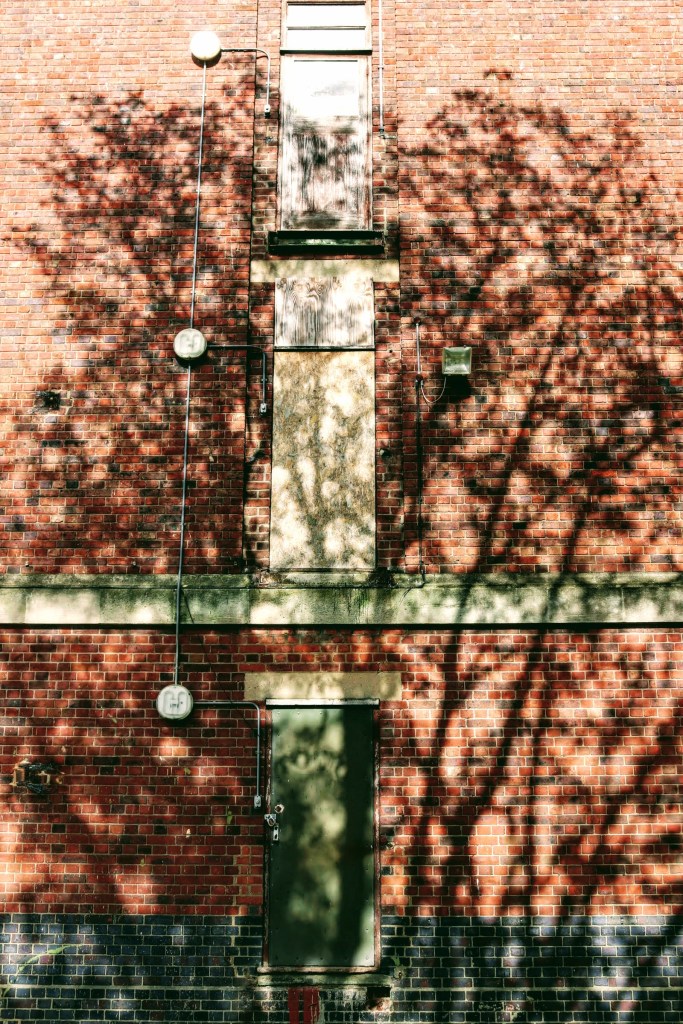 Nearby, and returning to the aeronautical theme of earlier, I cross the main road to the land which was once the proud home of RAF Uxbridge and Hillingdon House. It’s now another of London’s fashionable property developments, this one by St Modwen, and as I walk outside the building site I come to the end of one of the buildings. This one is a three storey building with doors leading nowhere, but what makes the picture more interesting is that the sun peeks out from behind the clouds and casts this majestic tree shadow.