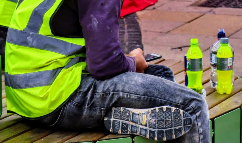 At the north end of the High Street, it’s market day so I have a chance to do some people watching, and this shot of workmen at rest eating their lunch outside the Pavilions shopping centre catches my eye. Their high vis jackets complementing their soft drink bottle colouring quite nicely.