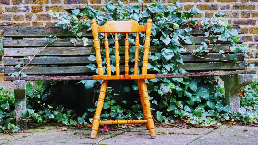 A wall plaque lays tribute to her time as ‘…someone who gave so much time and love to the community and surrounding gardens…’ Alas, the gardens seem to have fallen into neglect as I suspect no one has picked up the trowel to continue with the green fingered care. I don’t know if this chair was hers, but its positioning directly under the wall plaque would seem to indicate it was.