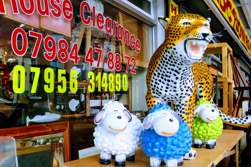 And despite the dank and dreary conditions of the day, there’s always an unexpeted and surprising moment to encounter when I least expect it. Where else would you find a leapord and three coloured sheep sharing the same table?