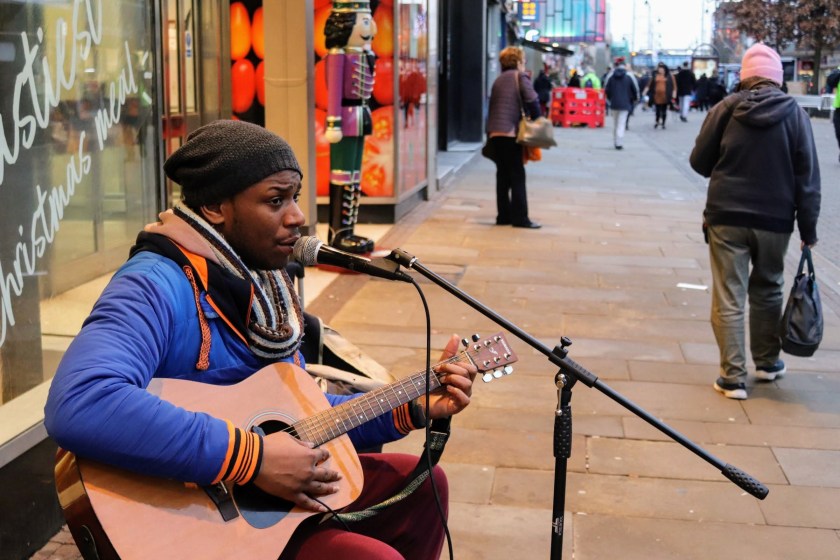 On most days you’ll encounter buskers in South Street or thereabouts. And today is no different, but what is different is their willingness or unwillingness to have their picture taken or engage in a conversation. As is the case with the first gentleman I encounter strumming his guitar alongside Santander just off South Street. He is most adamant that I do not take his picture – I wonder why?