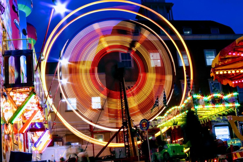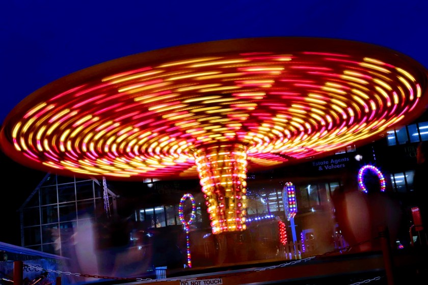 The week leading up to Christmas sees, amongst other festive events, a free mini funfair consisting of a ferris wheel, spinning teapots, haunted house, swing chairs and smaller rides for the younger folk. So not wanting to miss an opportunity, here are a couple of shots showing how colour and movement can be captured. I was a little surprised though that the funfair closed by 4.30 pm when I would have thought more folk would have been looking to enjoy the funfair. But I guess its timing is kept in concert with the market trading times. Anyway, all those there were really enjoying this free time.