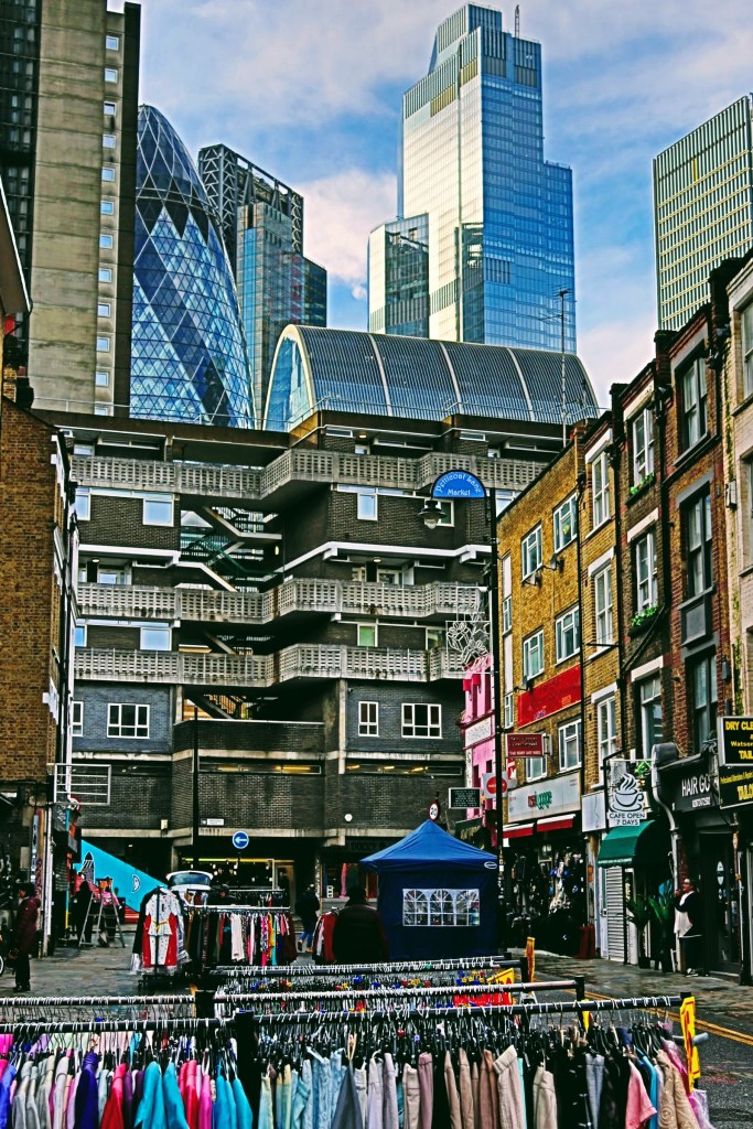 The market stands in the shadows of and within spitting distance of The City, with The Gherkin being the most notable skyline companion. And close by is the Sir John Cass School of Art, Architecture and Design, part of the London Metropolitan University.