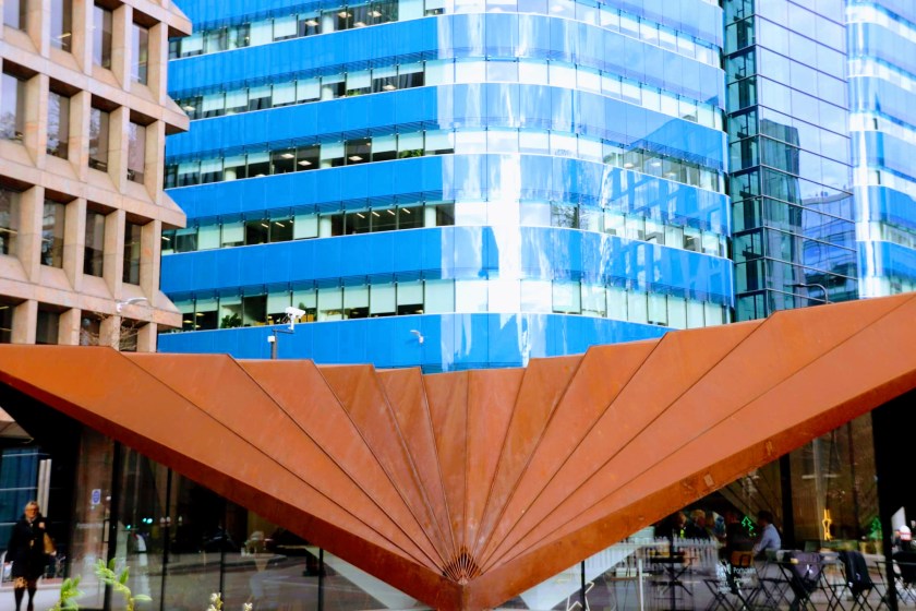 And adjacent to the station in Aldgate Square, there’s a coffee shop with an interesting design: it has a fan like roof as if capturing, or even embracing the surrounding office buildings.
