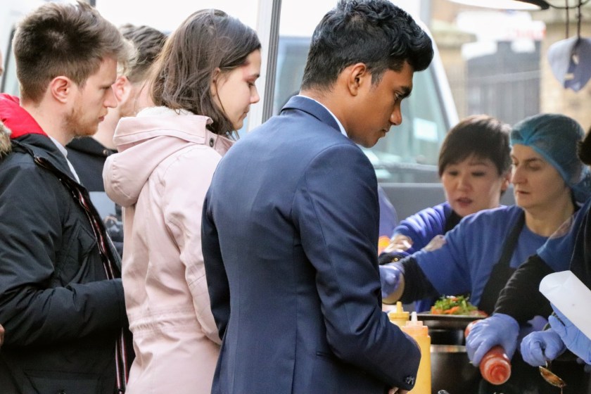 This picture was taken in the food market in Goulston Street, just off Wentworth Street, and is part of a series studying lunch-time office workers deciding on their food choice of the day. The street is lined with open air pop-up food stalls, and their menus and price guide erected high up on their stalls so that potential customers can see what’s on offer whilst they move around the crowds.