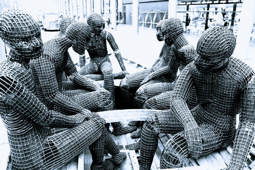 I’m standing amidst the crowds and slightly elevated when taking this shot, and I notice that those queuing to be served are all studying the menu board intently, oblivious to their surroundings. Presenting this in black & white helps to strengthen the observation, and I believe it also helps to focus attention on the three main subject’s gaze. The individual in the centrepiece has a simple ruggedness to him which playfully offsets the more traditional office gent on the right.