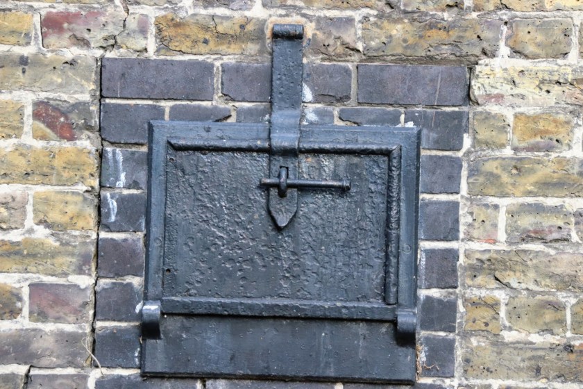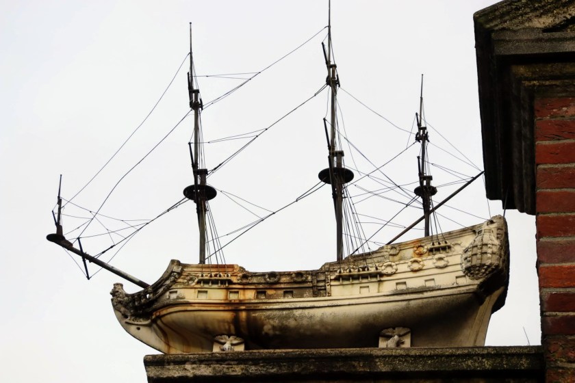 Trinity Green, a small conclave of Almshouses along the Whitechapel Road were built by the Corporation of Trinity House on ground given by Captain Henry Mudd for mariners. If you pass, look up at the roof line of the gatehouses where you’ll see these ships.