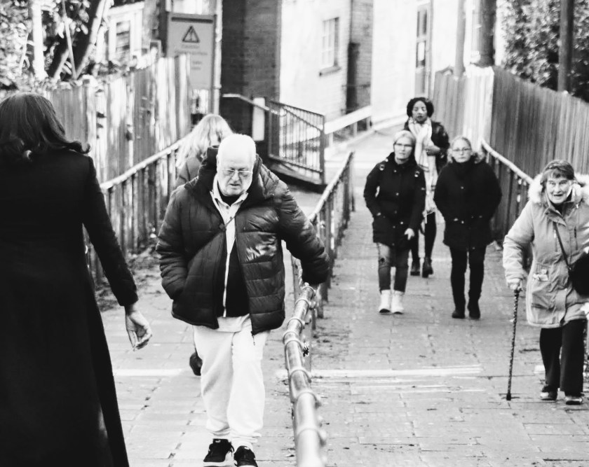 High Barnet station is at the bottom of a dip about one kilometre away from the main shopping area with a two hundred metre steep climb out of the station to road level. Even for the able bodied, this can be arduous, but for those less able, the three grab rails along the length of the footbath are a must as I observed at least two senior citizens struggle to make it to the top. The lady on the right of this picture stopped several times and she didn’t have a kind word to say about the footpath when she stopped to catch her breath besides me.