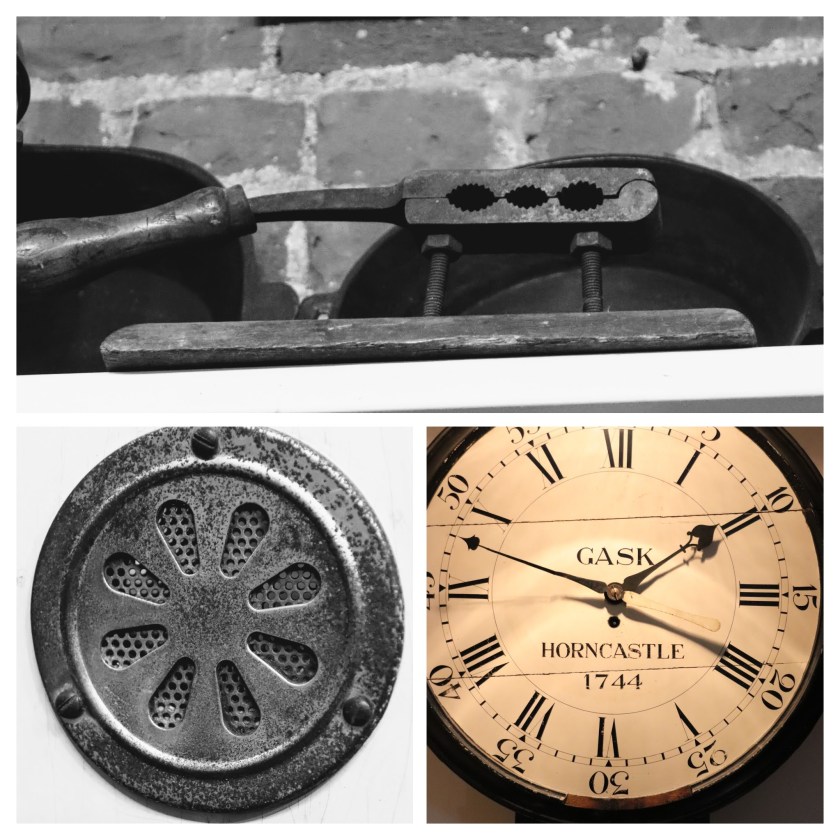 Domestic Life: this collage depicts several items you’d no longer find in the modern home. The first is a cork shaper used for compressing and shaping corks for sealing bottles and jars. The second is a door vent in a Victorian/Edwardian kitchen cabinet, and the third a rather attractive and elegant decorative clock.