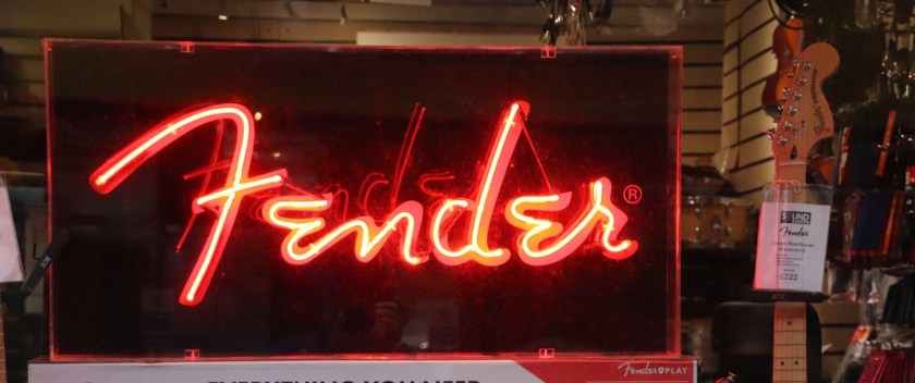 Further down the road, I stop outside The Sound Garden music shop and take in the Fender guitar maker’s sign which glows quite brightly in the gloomy afternoon.