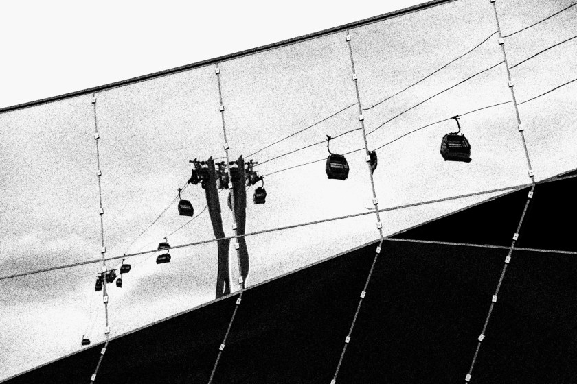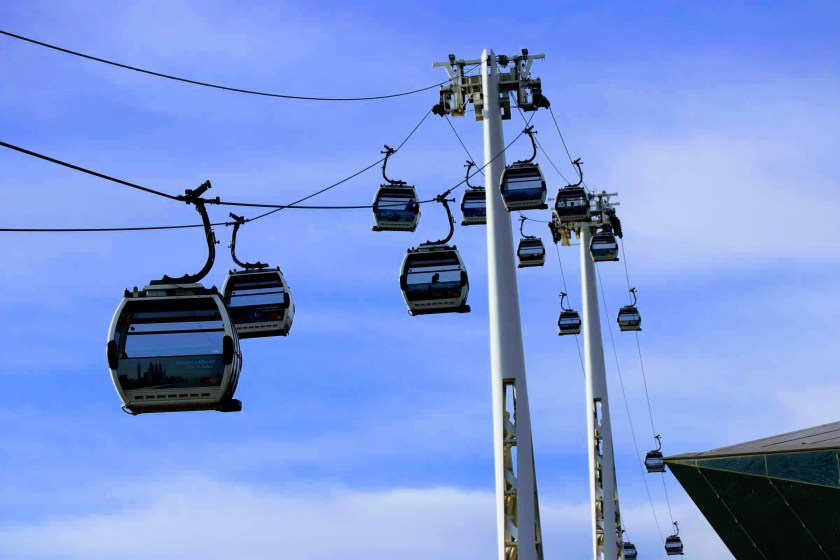I end my day where I started, but spend a little time reflecting on the moody lighting which casts a soft shadowy glow on the footpath as a few revelers head for the DLR or to one of the nearby hotels. The overhead gondolas continue to pass robotically by, regardless of whether they carry any passengers, and I decide it’s time to get back into the warm…so it’s homeward bound for me too.